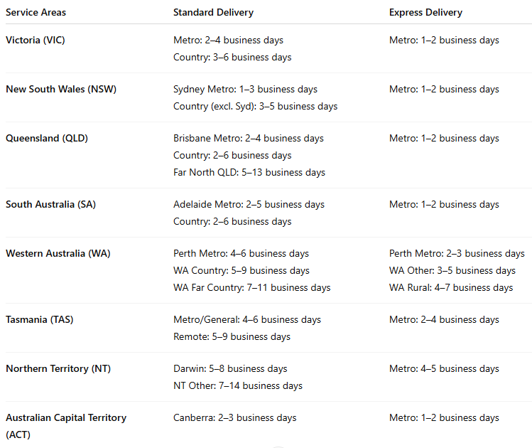 - Express Shipping: Orders placed before 12:00 PM will be shipped the same day for next-day delivery to metro areas. Regional areas may take an additional day.